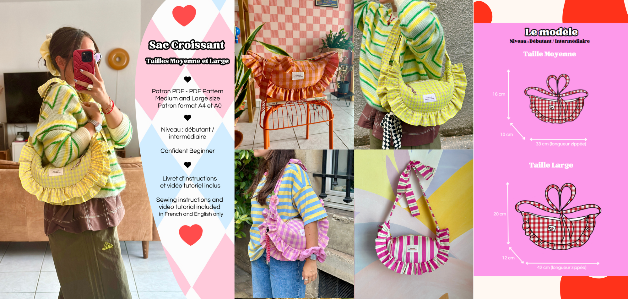 SAC CROISSANT Taille Moyenne et Large - Vichy bleu - Fait main à Reims (France)
